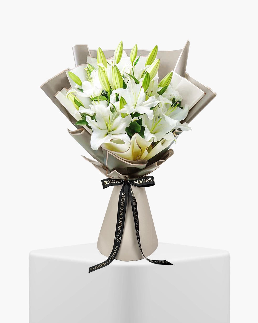 The Beautiful Lilies Bouquet showcases white lilies arranged in a refined wrap. White lilies symbolise dignity, purity, and composed strength. Their upright form conveys stability, while the clean petals communicate respect.
