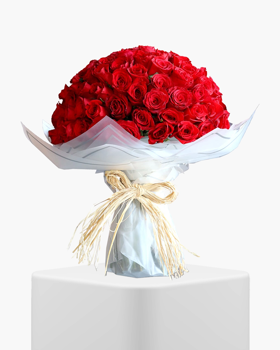 Passionate Red Rose flowers feature structured red roses arranged in a classic bouquet format. The clean presentation allows the richness of the colour to stand out clearly.