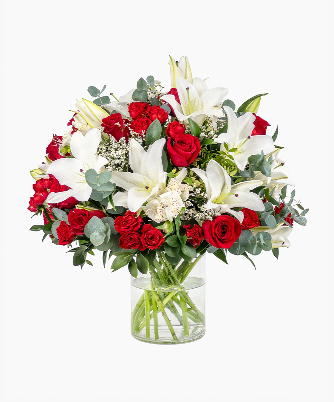 Wish someone by sending this blossom arrangement to give a gentle and reassuring tone. Red roses and white lilies create a strong contrast, blending warmth with calm elegance. Alstroemeria and limonium add softness and light detail, while baby red roses bring extra warmth to the design. Eucalyptus and ruscus introduce fresh texture and structure. Arranged in a clear cylinder vase, the overall look feels balanced, modern, and emotionally expressive.