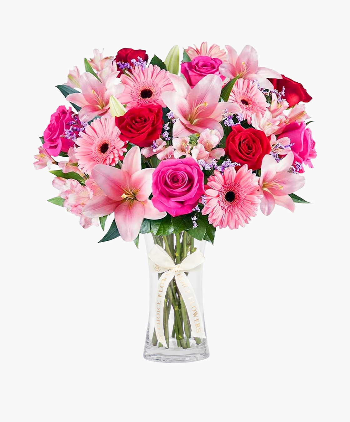 Share your warm thoughts by offering this bloom arrangement to give a soft and cheerful impression. Red roses form the main structure with bright colour, while pink roses add gentle balance to the palette. Limonium and ruscus give light detail without altering the shape. Placed in a clear vase, the design stays neat, bright, and easy to place. A fresh floral piece that brings a welcoming feel to any space.