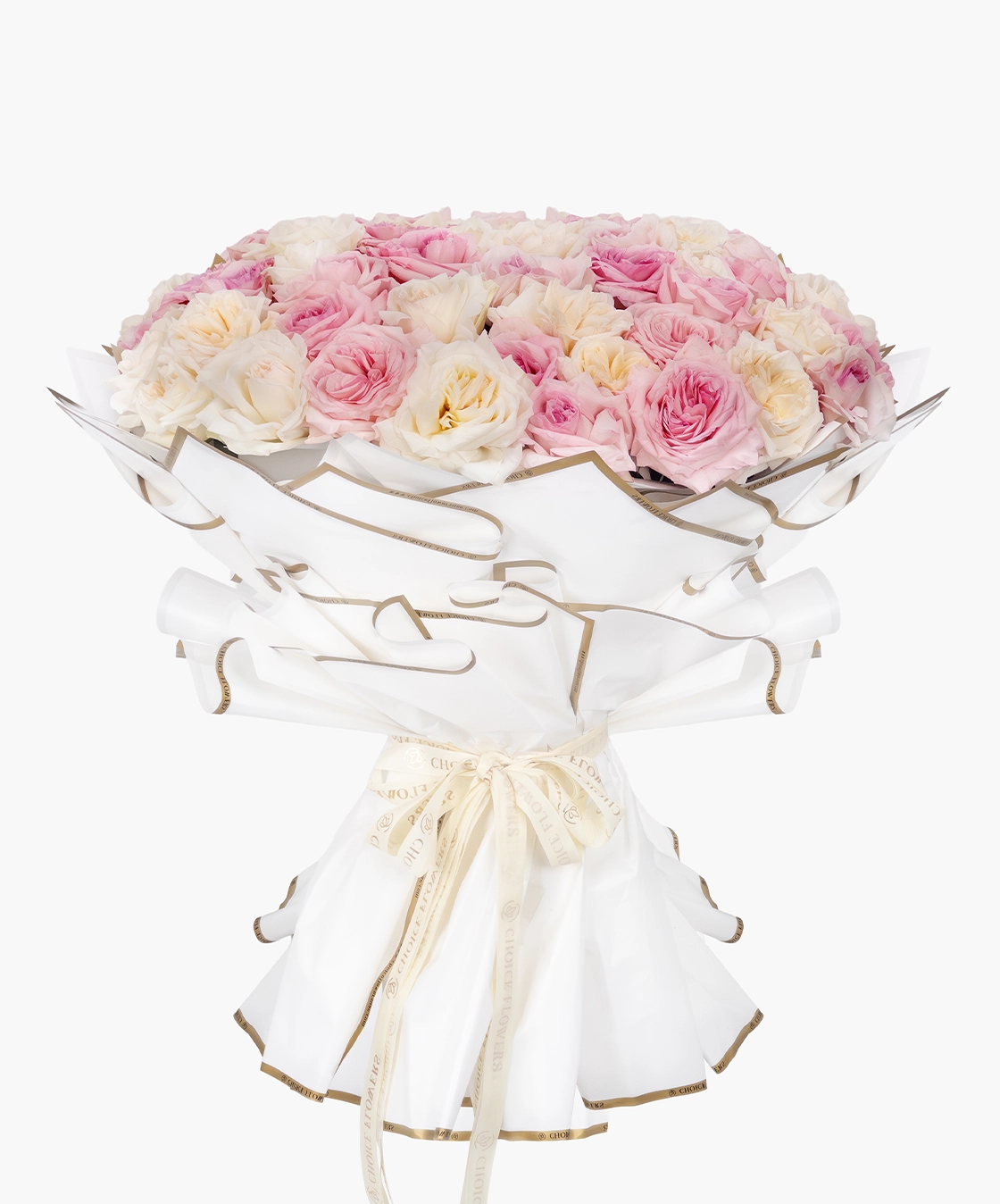When you want to express grace and heartfelt warmth, this rose bouquet does it effortlessly. Soft O’Hara white and pink roses come together in gentle harmony, creating a look that feels calm, elegant, and sincere. Wrapped neatly with refined layers and finished with a ribbon, it is perfect for thoughtful gifting and tender moments.