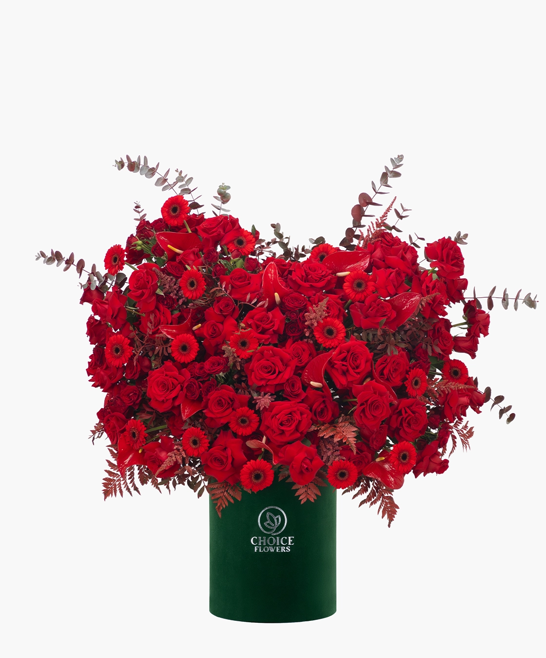Make a powerful impression with a couture-inspired floral arrangement crafted for bold expression. Layers of rich red blooms are composed with precision, creating depth, texture, and striking visual balance. Presented in a premium box with refined greenery, this design reflects confidence, sophistication, and elevated floral artistry.
