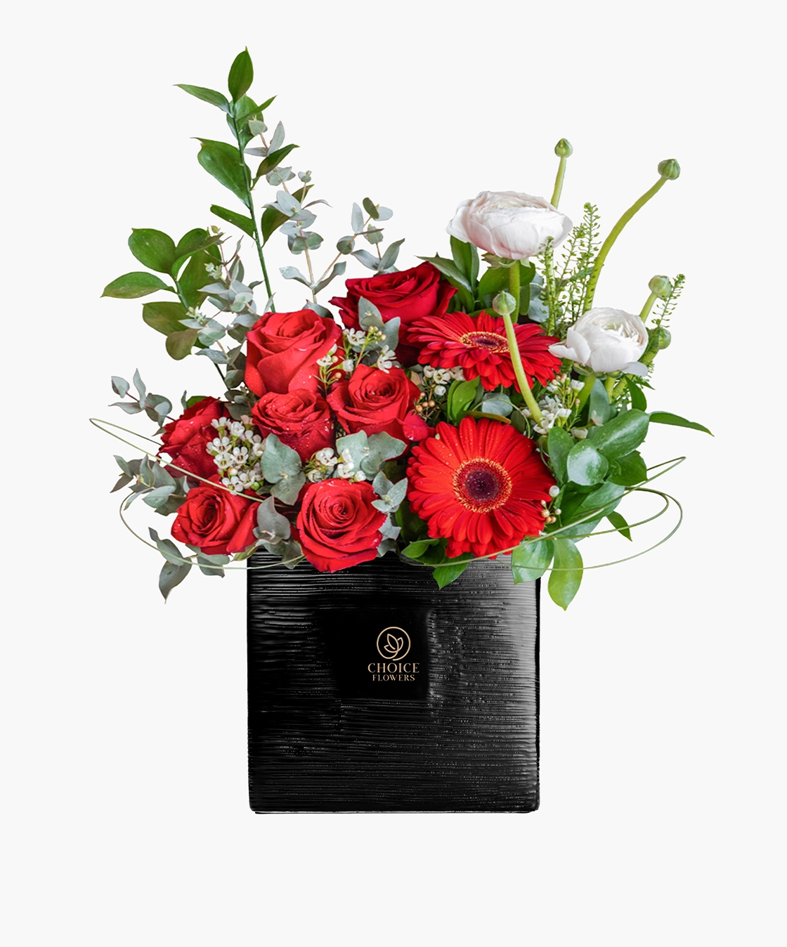 Express a warm Valentine’s gesture with this flower arrangement styled to give a bright and balanced impression. Red roses create a strong base, while gerberas add open colour and freshness. Ranunculus brings gentle softness to the mix, keeping the look light and composed. Set in a black vase, the arrangement feels modern, lively, and visually clear. A charming floral choice for Valentine’s moments that feel cheerful and sincere.