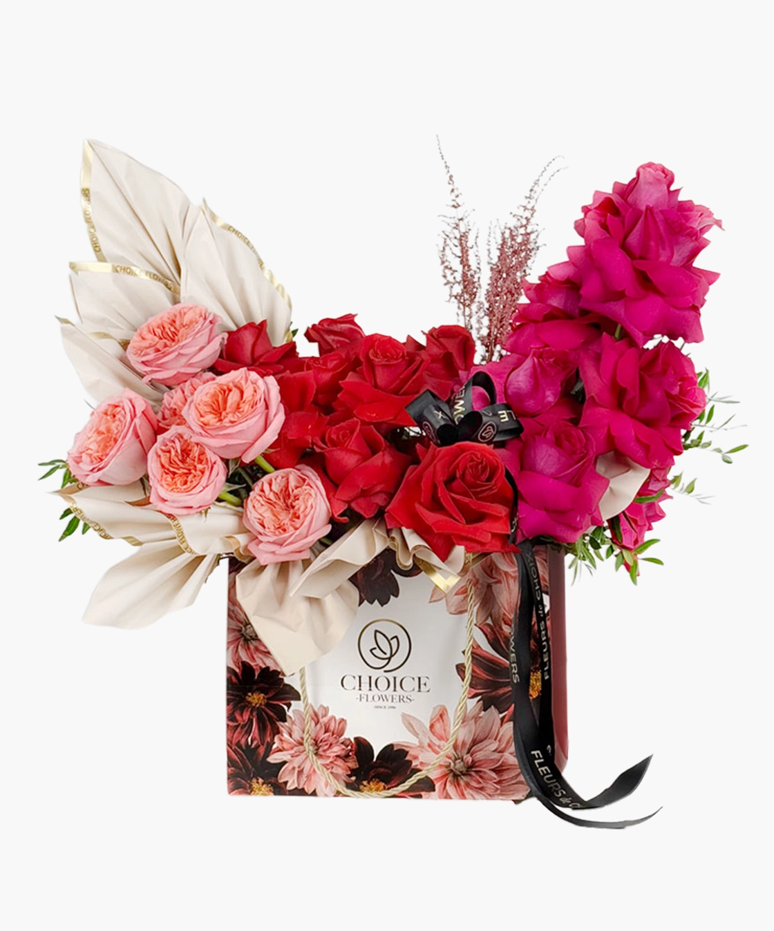 Share your wishes by presenting this flower arrangement to give a colourful yet well-organised impression. Red, fuchsia, and pink roses form a full rounded dome, while pink astilbe adds height and light texture. Pistachio foliage supports the structure and keeps the outline compact. Arranged in a small gabled gift box with ribbon, the design stays neat, bright, and easy to gift.