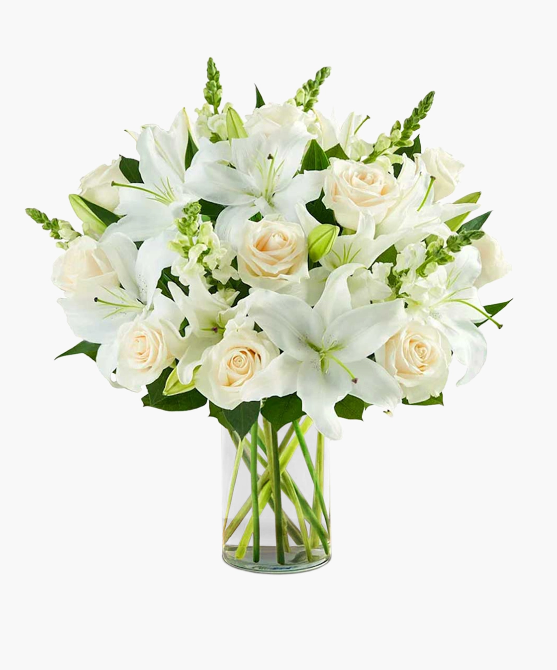 Express your thoughts by presenting this flower arrangement to give a clean and graceful impression. White lilies form the main focal point, while white roses and matthiola fill the centre evenly to keep the shape balanced. Set in a clear glass vase, the arrangement stays fresh, uncluttered, and visually light.