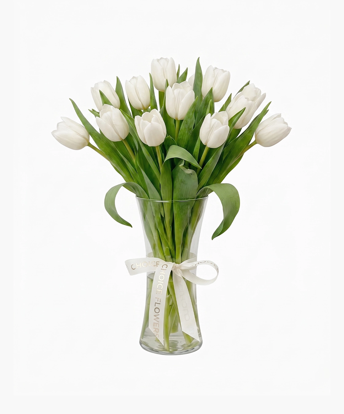 Featuring 50 fresh white tulips, this arrangement creates a full, balanced display that brings calm sophistication to any space. The clean glass vase highlights the natural beauty of the stems, while the soft ribbon detail adds a subtle premium finish.